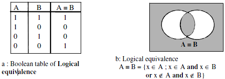 .\ The logical equivalence of two binary sets A and B is described in the boolean table of the figure below.